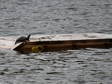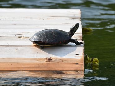 Turtles source out locations for basking that often consist of fallen trees, driftwood or exposed rocks, logs, dead heads, emergent vegetation, etc. A site for basking would be selected because it is ideally positioned in the water to optimize sunlight exposure and is not too far from the shoreline; open water will make turtles feel vulnerable. Turtles occasionally bask on a shoreline or sand, but this would be in chosen circumstances when they do not feel vulnerable to predators. Sometimes, turtles get creative and bask on docks, rafts, exposed culverts, discarded items floating in the water, etc.