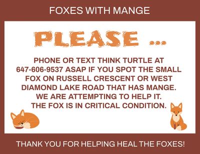 If you have any information about the foxes' whereabouts, please phone or text us at Think Turtle 647-606-9537 ASAP. Do not send a Facebook message or comment about a sighting we are working outdoors and will not be able to check on Facebook messages until the evening. Phone or text 647-606-9537.
