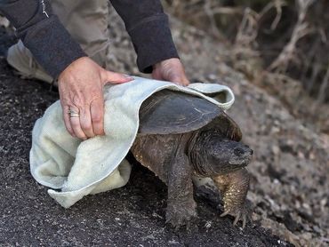 Although your intentions may be well-meaning, if you are uncomfortable with a hands-on approach to assisting medium—to larger-sized turtles across the road, please refrain from attempting this to avoid possible harm to yourself and the turtle.