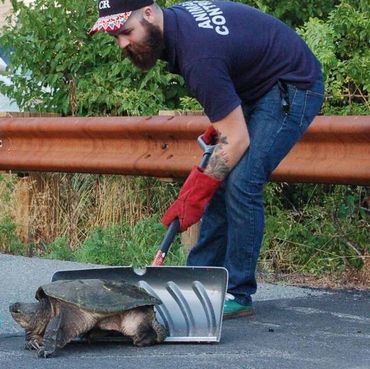(F) Shovel To Scoop — Depending on the size of the turtle, a shovel can be used to gently scoop the turtle off the road and carry him/her across the road in the direction the turtle was headed. It is very important that the shovel is not raised too high off the ground and that it is big enough to contain the turtle so it does not fall out and sustain an injury. For this reason, snow shovels are more commonly used.