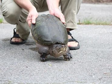 Special care is required when assisting a snapping turtle across the road. These turtles may be as much as 19 inches long, weigh up to 36 pounds, and have powerful legs and jaws. To safely handle a large snapping turtle, 'AVOID' the front half of the turtle's body. Be sure that your hands and arms are always beyond the reach of the snapping turtle's long neck.