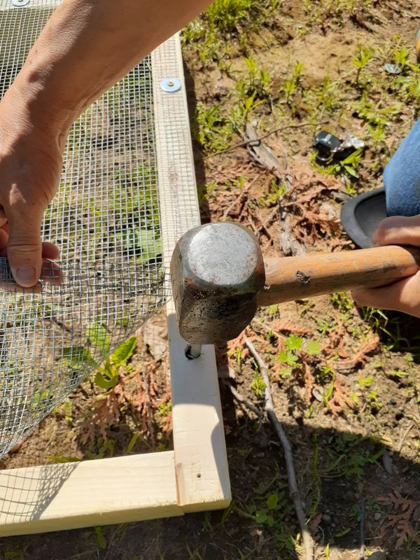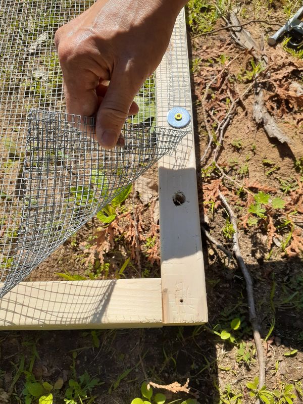 That being said sometimes hardware cloth is not available and chicken coop wire is a material many people have stashed away, and may be looking to use to save money. If you are considering using chicken coop wire instead of hardware cloth we suggest securing one layer of chicken coop wire to the top of the nest protector frame (stapling is easiest) and then a second layer stapled in place on top of the first layer in such a way that it dissects the large openings in the first layer, making smaller openings overall (see photos below)..