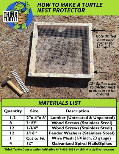 The following are instructions for constructing a standard wood frame nest protector. This vital tool, successfully used by the Think Turtle Conservation Initiative for several years, plays a crucial role in deterring predators and protecting many nests. If you substitute materials or make changes to the methods of construction outlined, please keep the general principles of a turtle nest protector in mind.